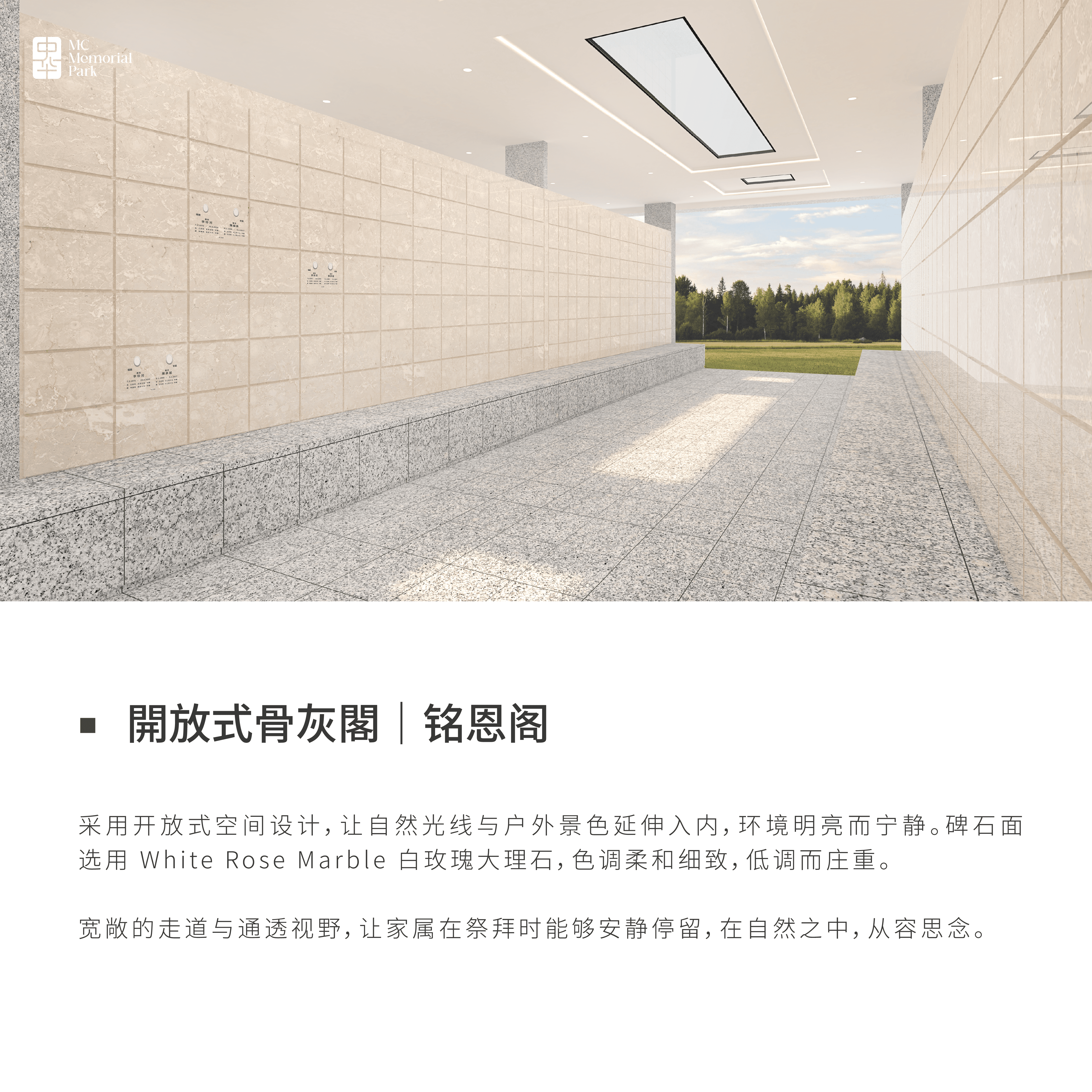 铭恩阁设有开放式骨灰阁,采用通透的空间设计,引入自然光线与园区景观,使室内外视野自然延伸。